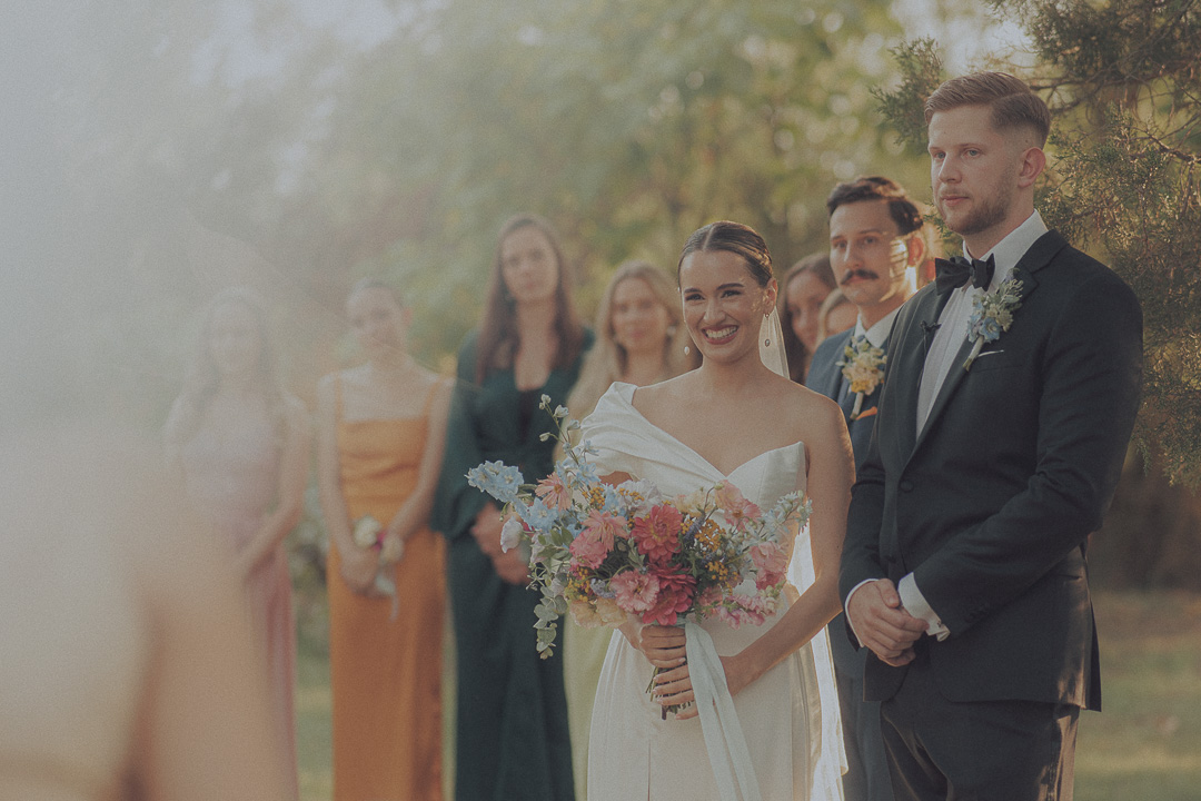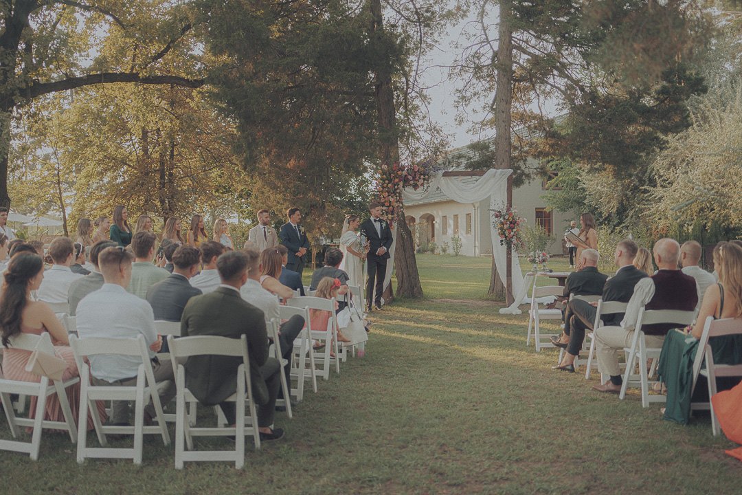 A ceremónia helyszíne a fények szempontjából telitalálat. Nincs szükség épített boldogságkapura, a két hatalmas fenyő pont elég keretet ad a pillanatnak. Ha jól van eltalálva az időzítés, a lemenő nap a fák közül, pont a pár mögül szűrődik át - Fotósként ennél jobb természetes világítást nem is kívánhatnánk ahhoz a dokumentarista megközelítéshez, amit képviselünk: itt nem kell megrendezni, a fények teszik teljessé a pillanatot.